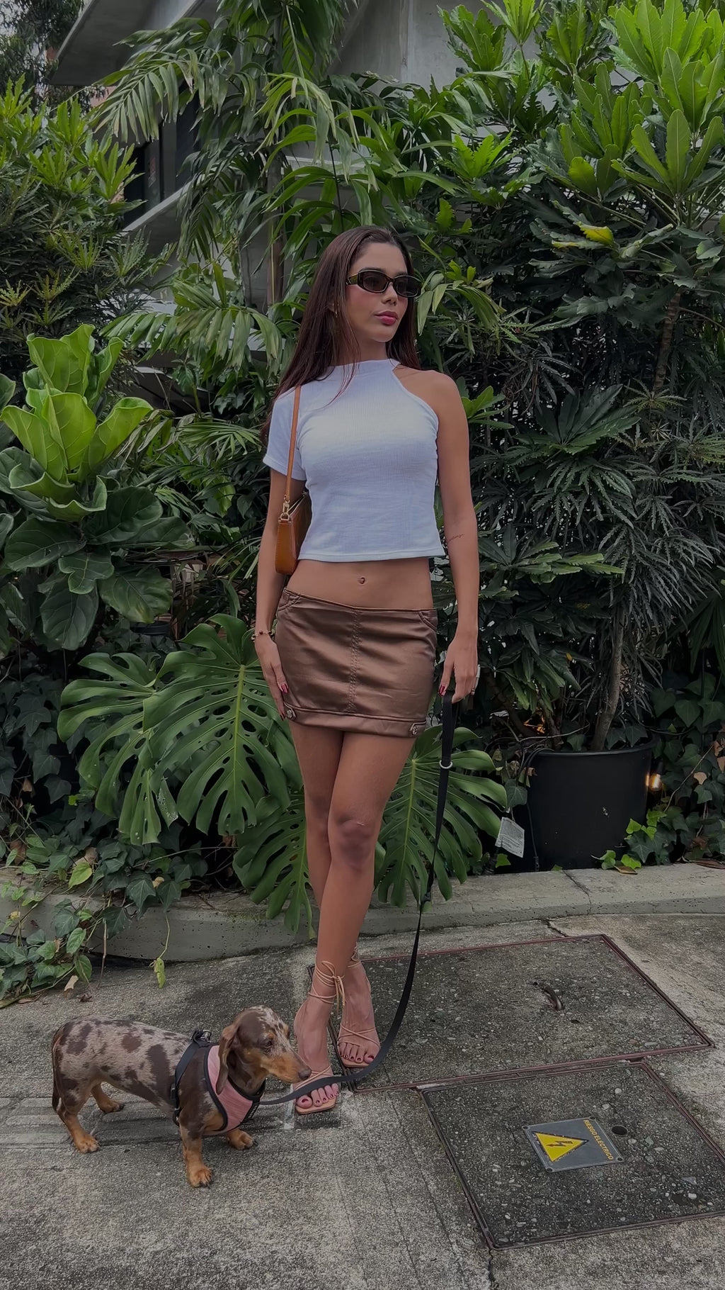 Mini skirt, low rise, brown leather.